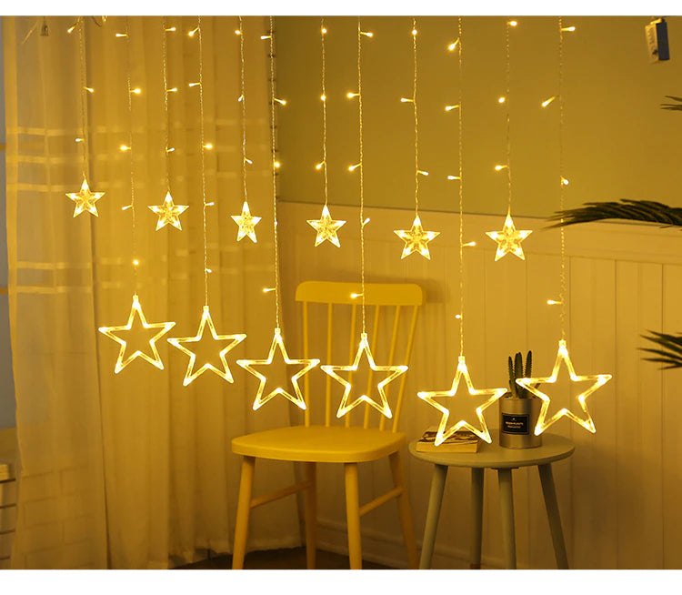 Instalatie perdea luminoasa LED de 4m, 12 stele, mari si mici, interconectabila, 8 programe, Alb Cald si Multicolor