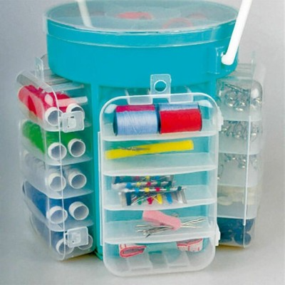 Toate accesoriile pentru cusut sunt organizate in compartimente separate, asezat circular, in forma de turn, astfel incat sa fie toate vizibile si usor de accesat.